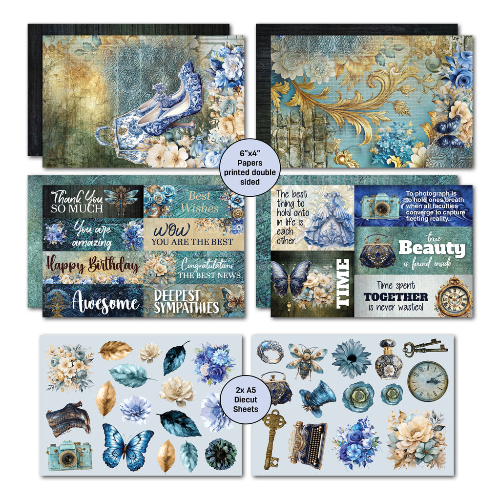 - 16x 5.8" x 3.8" double sided papers or ephemera Items. These papers are intentionally cut smaller than the cards to give a crisp white border