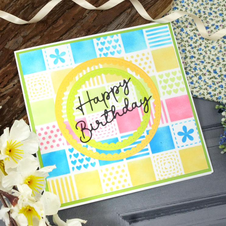 Create gorgeous patchwork-inspired backgrounds, borders and frames with the For the Love of Masks - Pretty Patchwork Pattern 6” x 6” mask. The mask features multiple tiles with a variety of patterns throughout. Ink through the mask for a 6” x 6” background or tile the design as many times as desired for larger cards and crafty projects. Alternatively, mask off sections using Low-Tack Tape to ink corners or borders.
