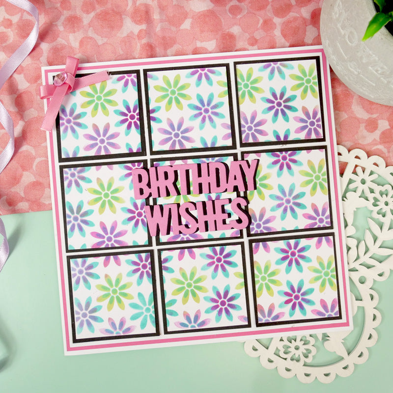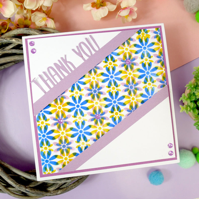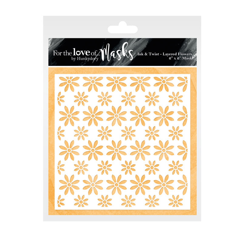 The For the Love of Masks - Ink & Twist - Layered Flowers 6” x 6” mask will create a beautiful floral pattern, perfect for your card fronts, and will work for a variety of themes and occasions. The mylar mask will ink the perfect background for a 6” x 6” card blank or why not try tiling the pattern to create backgrounds for larger cards or crafty projects?
