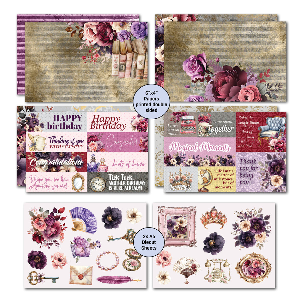 - 16x 5.8" x 3.8" double sided papers or ephemera Items. These papers are intentionally cut smaller than the cards to give a crisp white border