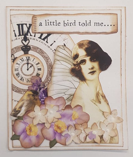 The 3Quarter Designs Wings Mini Project Sheet has a vintage feel with images of a woman in vintage clothes, butterfly wings, flowers, a clock and text 'a little bird told me....'. These A4 sheets are perfect to use to create an easy mini project. Acid and Lignin free.