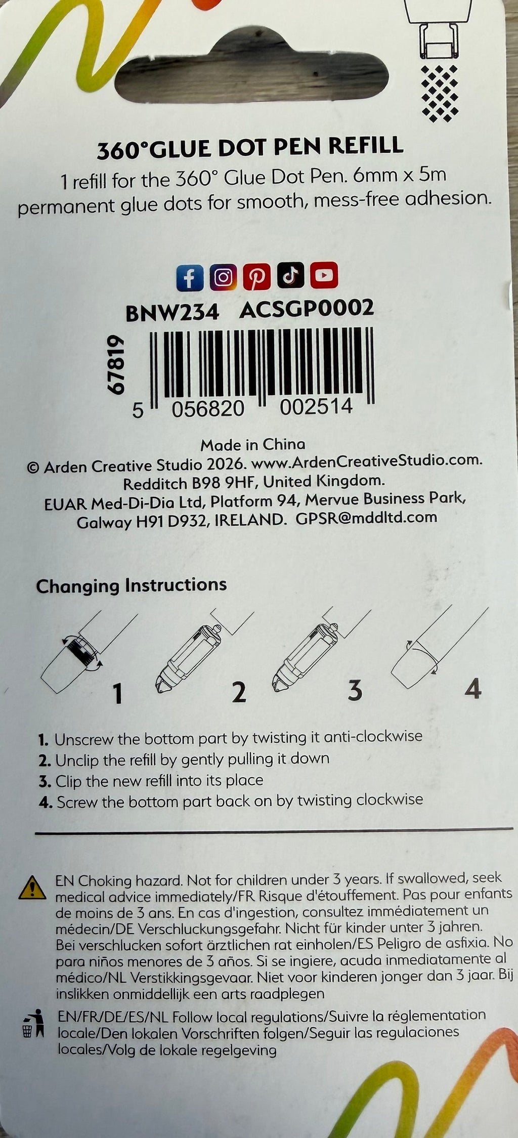 Keep your Arden Creative Studio 360° Glue Dot Pen ready for every project with this easy-to-use refill. Designed to deliver the same smooth, precise, and mess-free adhesion as the original, it features a 6mm-wide, 5m-long roll of permanent glue dots - perfect for scrapbooking, cardmaking, journaling, and more.