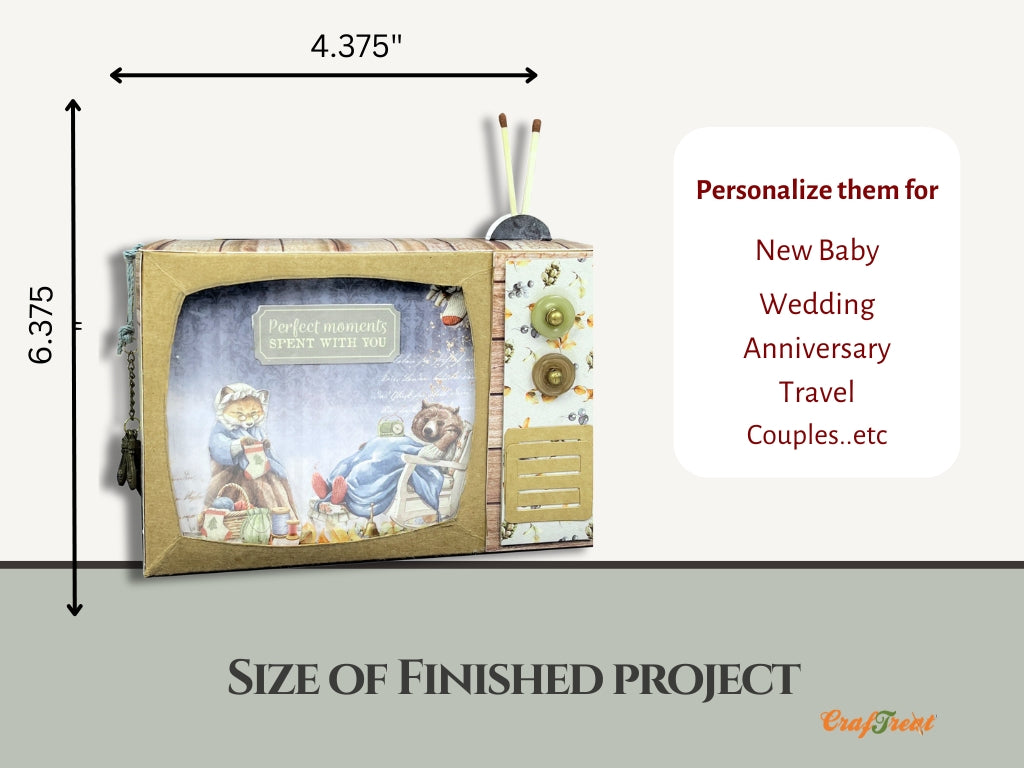 CrafTreat TV Pop up mini album Kit contains : White pre cut base for 1 set of 4.375x6.374x2"  TV frame that houses 4.25"x6.25" interactive album with pop up elements.  Perfect for capturing special memories in a unique, nostalgic design. Personalize it with your favorite papers and embellishments for a one-of-a-kind keepsake. Ideal for gifts, craft events, and scrapbook lovers!