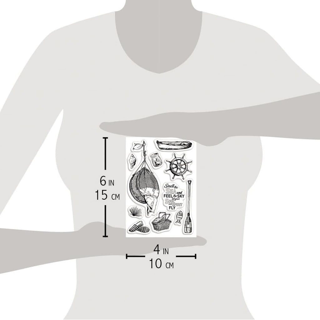 - 11 Stamp Set includes images of a swing, fish, a boat, shells, picnic basket and sentiment 'Smell The Sea And Feel The Sky Let Your Soul And Spirit Fly'