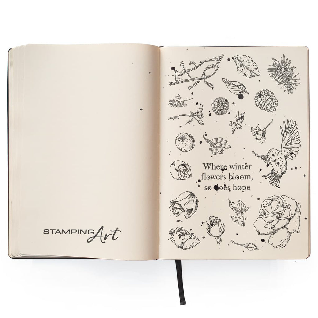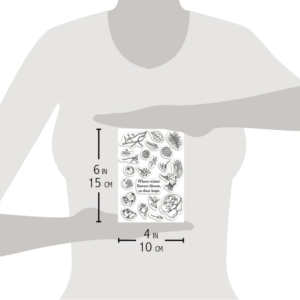 - 21 Stamp Set includes images of roses, branches, berries, pine cones, a bird and sentiment 'Where Winter Flowers Bloom So Does Hope'