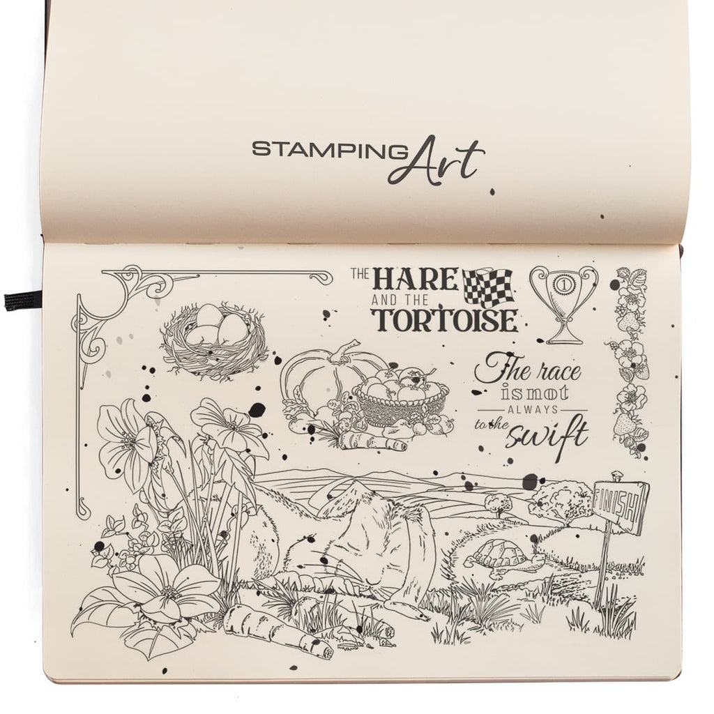 - 8 Stamp Set includes a scene from the hare and the tortoise fable, extra embellishments to finish your projects and 2 sentiments