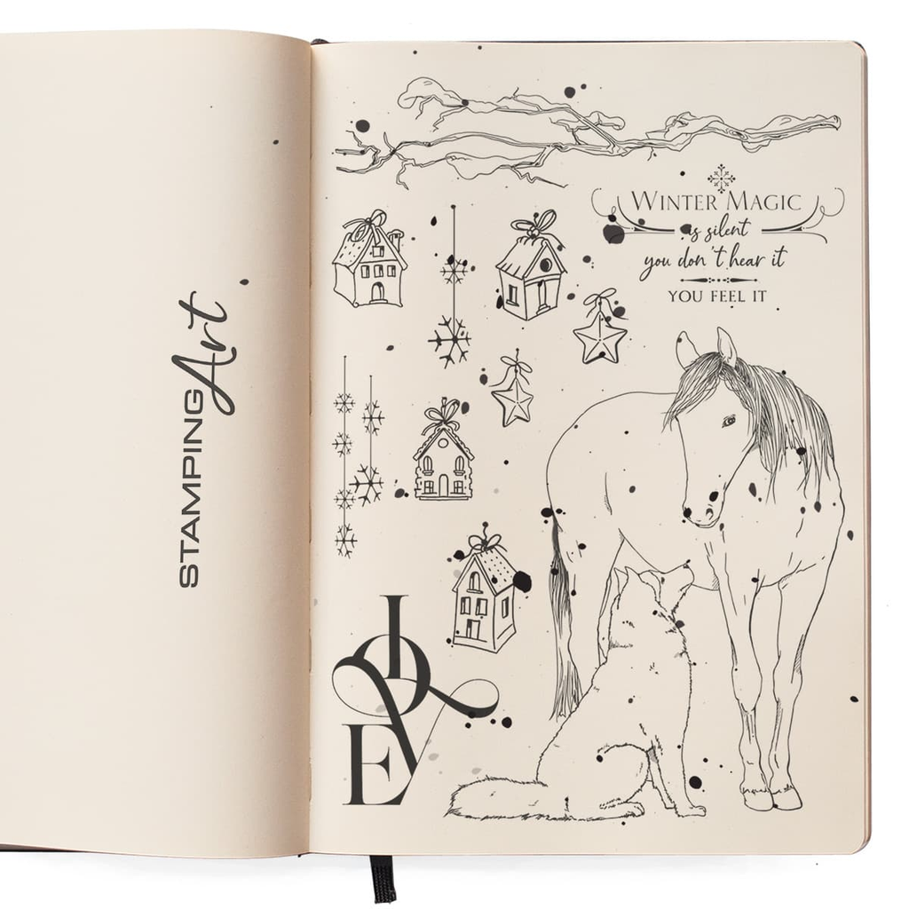 - 12 Stamp Set; includes images of a horse and dog, a branch, birdhouses, snowflakes and sentiments