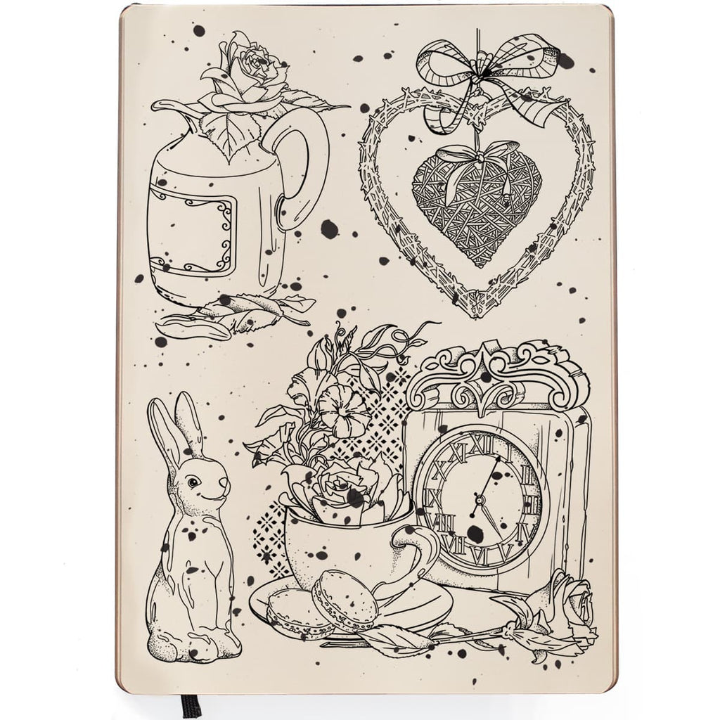 This is a 4 Stamp set with images of rabbit, flowers, a clock, a teacup and a heart