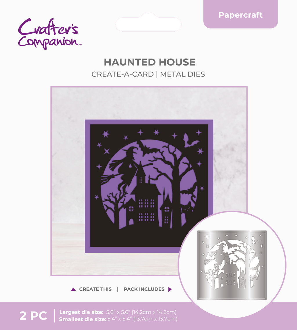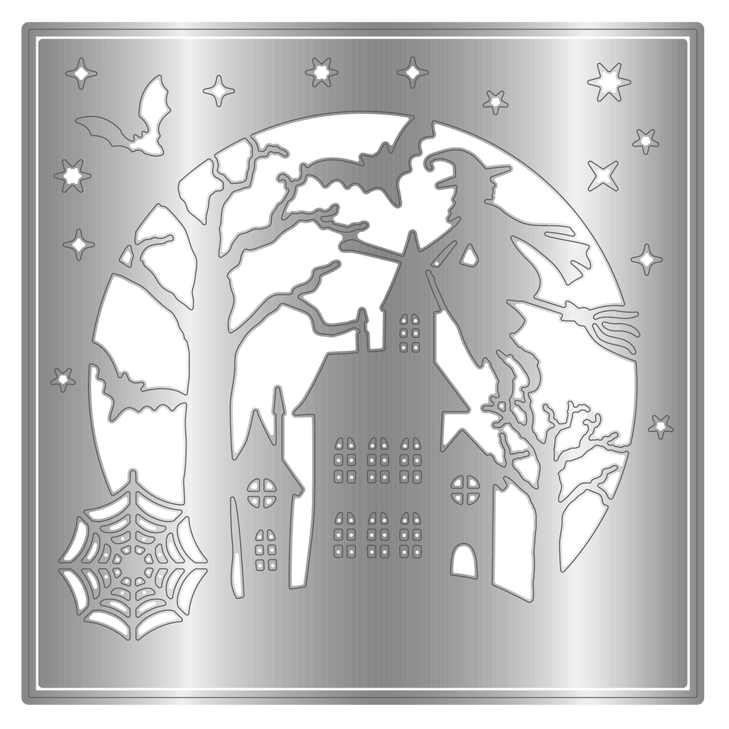 • 2-piece metal die set to create a haunted house silhouette with bats, stars, trees and a witch flying on a broomstick
