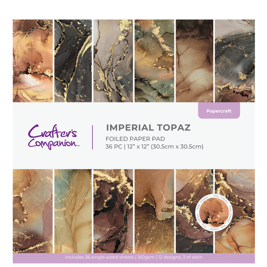 Beautiful 12"x12" Imperial Topaz paper pad from Crafter's Companion. This pad includes 36 single-sided sheets of foiled paper, with 12 designs, 3 of each, 160gsm.