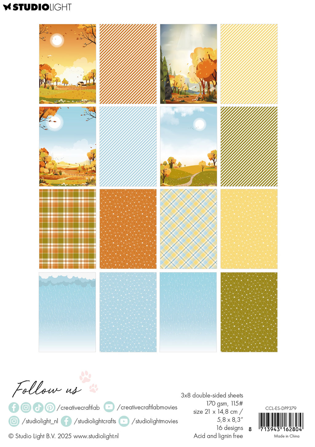 This paper pad has an Autumn theme. Includes 24 sheets (3x 8 double-sided sheets) with 16 designs, 170gsm, acid free paper. Perfect for cards, scrapbook layouts and journal pages. Part of the Creative Craft Lab Essentials collection.