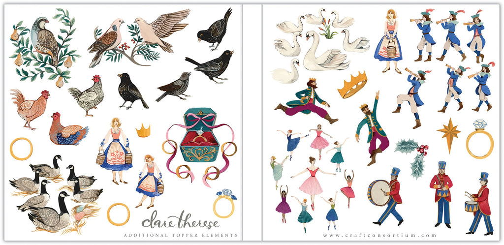 Craft Consortium are delighted to announce the exclusive launch, of their brand-new premium collection, designed in partnership with world renown illustrator, Clare Therese Gray. Introducing; '12 Days of Christmas'. '12 Days of Christmas' - The Christmas Carol, which has been inspirationally illustrated and brought to life by the incredibly talented Clare Therese, showcases the iconic gifts given by their 'True Love' on each of the 12 days of Christmas. Supported by a series of premium patterned card stock, coordinating stamp set and an array of embellishments, from chipboard ephemera, rub-on transfers and washi tape, this collection is truly one not to be missed.