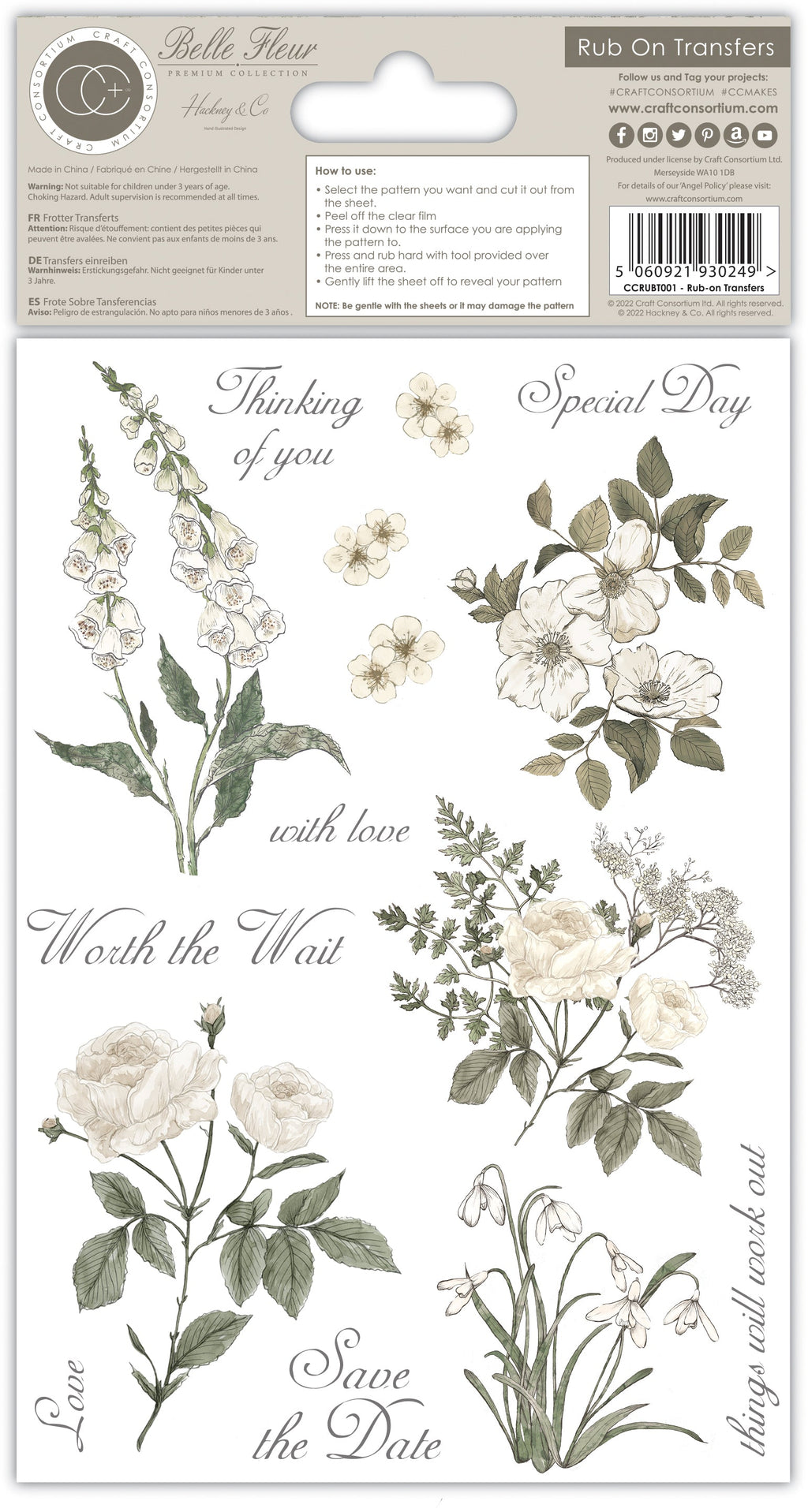 A set of 2 sheets of rub-on transfers with beautiful floral images. Also includes a rub-on tool. (Sheet Size 185mm x 125mm). This rub-on transfers set co-ordinates with the 'Belle Fleur' premium papercraft collection.