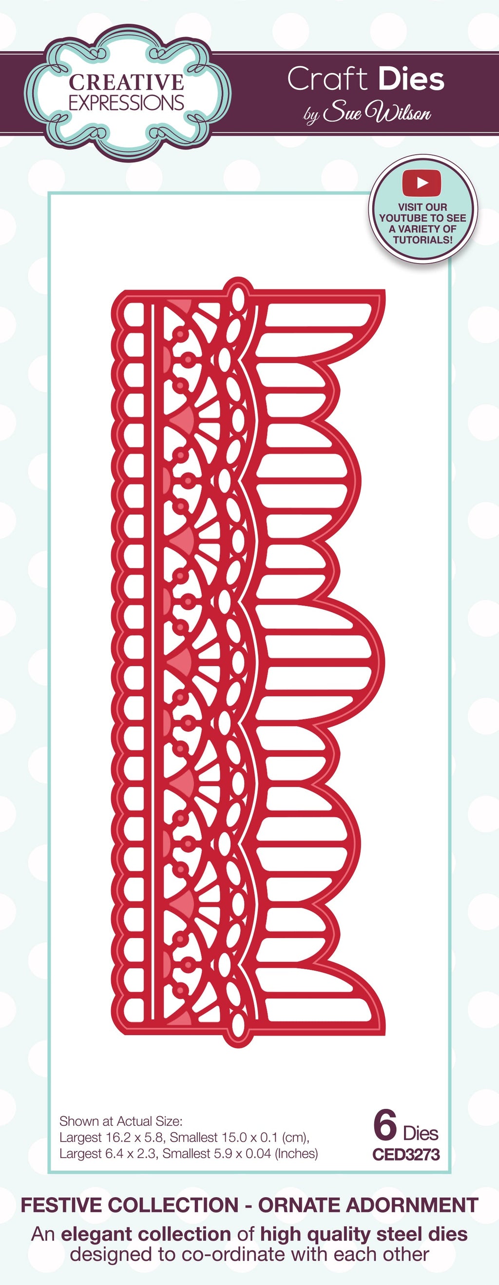 The Ornate Adornment craft die is a great addition to Sue's Festive Collection. Use with the Opulent Baubles & Vintage Baubles dies to create gorgeous arrangements. The high quality steel dies are compatible with most home die cutting machines and will work with the other dies in the collection or on their own. Made In China. 6 dies. Largest die 16.2 cm x 5.8 cm (6.4 ins x 2.3 ins).
