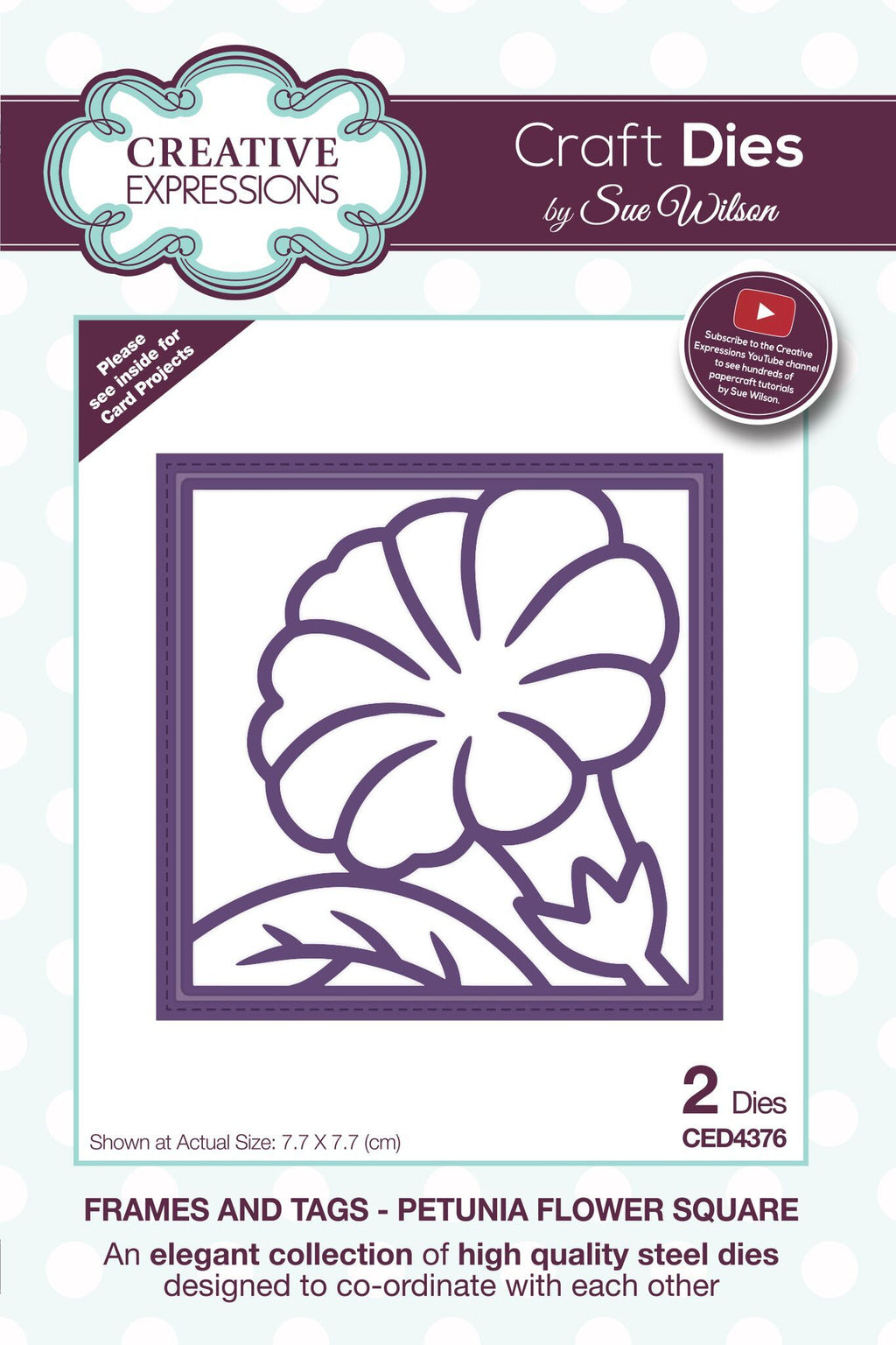 Frames and Tags - Petunia Flower Square. Creative Expressions Craft Dies by Sue Wilson form an elegant collection of high quality steel dies designed to co-ordinate with each other. Includes 4 dies. Size: 3 x 3 in