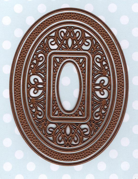 The Geneva outer shape is oval and it aligns perfectly with the Double Pierced Ovals dies too. The Geneva has an outer die that has random piercing as it's feature and it looks stunning when cut!