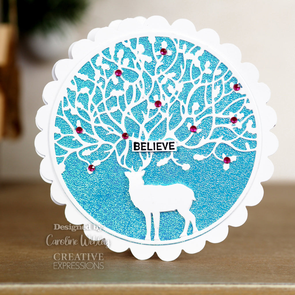 This stunning design has been hand drawn by husband and wife duo Louise and Ryan Firchau expert paper cutters. These gorgeous designs are created in a distinct and exquisite style and are much sought after. This winter stag is a beautiful combination of animal and tree and will create really impressive Christmas and winter cards and other paper craft projects. This die set will work beautifully with the other festive dies, the possibilities are endless. The dies are compatible with most home die cutting machines.  Size 12.2 cm diameter. 2 die set.
