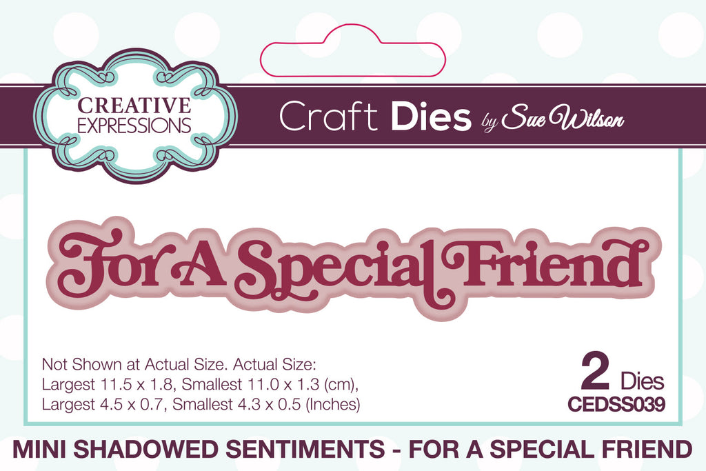 The Mini Shadowed Sentiments For A Special Friend Craft Die from Sue's collection is perfect to add the finishing touch to all your cards and paper craft projects. This die set will work beautifully with the other dies in the collection. The high quality steel dies are compatible with most leading die cutting machines. Made In China. 2 dies. Size 11.5 x 1.8 cm (4.5 in x 0.7 in).