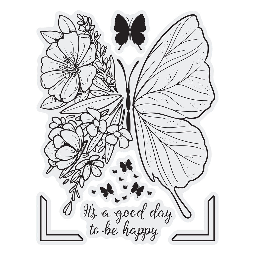 Create a nature scene with this six piece stamp set. Includes images of butterflies and text 'It's a good day to be happy'.