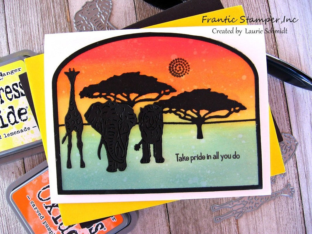 6"x6" clear stamp set featuring an A2 sized jungle leaf frame, coordinating jungle leaves and fern fronds, and several cute jungle animal sentiments.