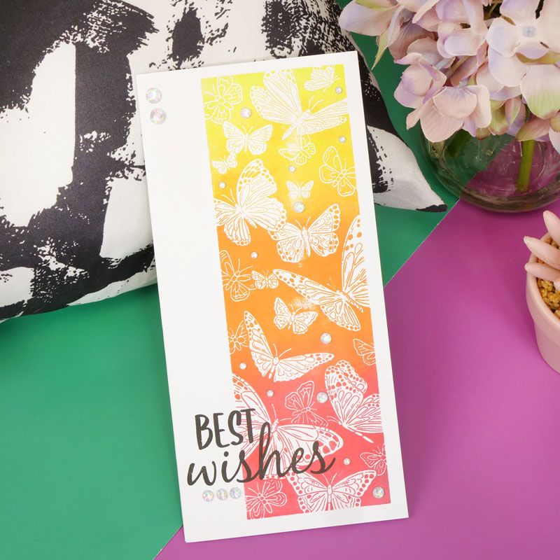 With a whole spectrum of colours to choose from, make the many butterflies in flight pop from the solid background for a unique centrepiece image. For the Love of Stamps - Butterfly Trail includes 1 large ‘strip’ stamp making it ideal for a variety of card sizes and occasions. Hunkydory recommend stamping the image in black ink so you can use their range of Prism Pens, Pencils and Ink Pads to colour the large centrepiece butterflies with ease. Create stunning ombré and sunset-style effects or try intricate colouring without the worry of colouring outside the lines!