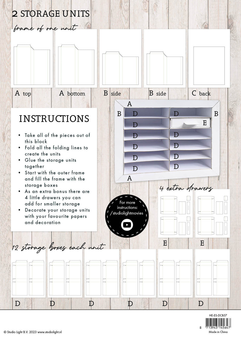 This A4 set includes 24 die-cut papers to create two storage units with 12 storage boxes in each unit perfect for storing ink pads . As an extra bonus there are four little drawers you can add for smaller storage. Decorate your storage units with your favourite papers and decorations. 300 gsm white cardstock, acid and lignin free.