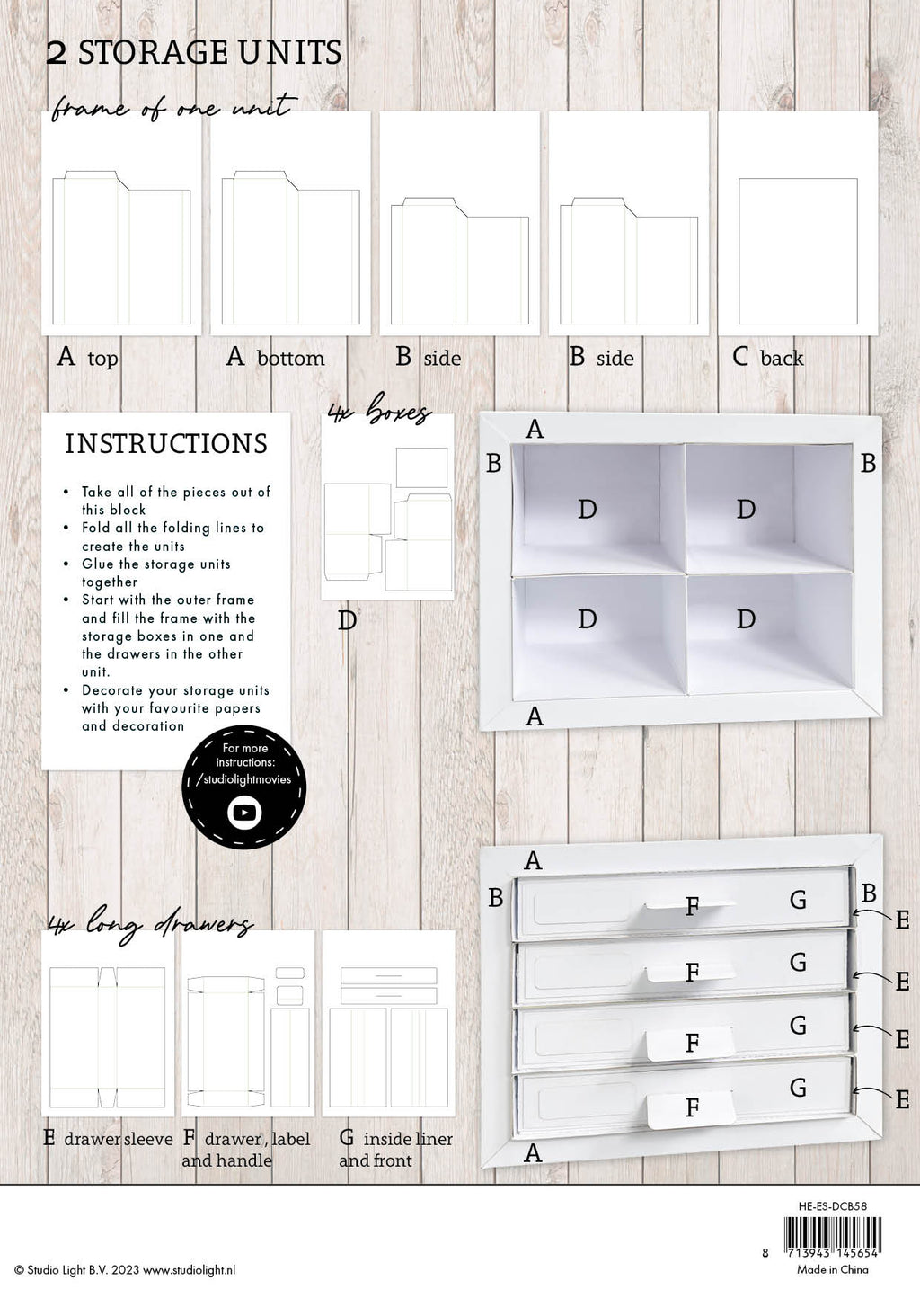 This A4 set includes 24 die-cut papers to create one storage unit with drawers and one storage unit with four compartments. Decorate your storage units with your favourite papers and decorations. 300 gsm white cardstock, acid and lignin free.