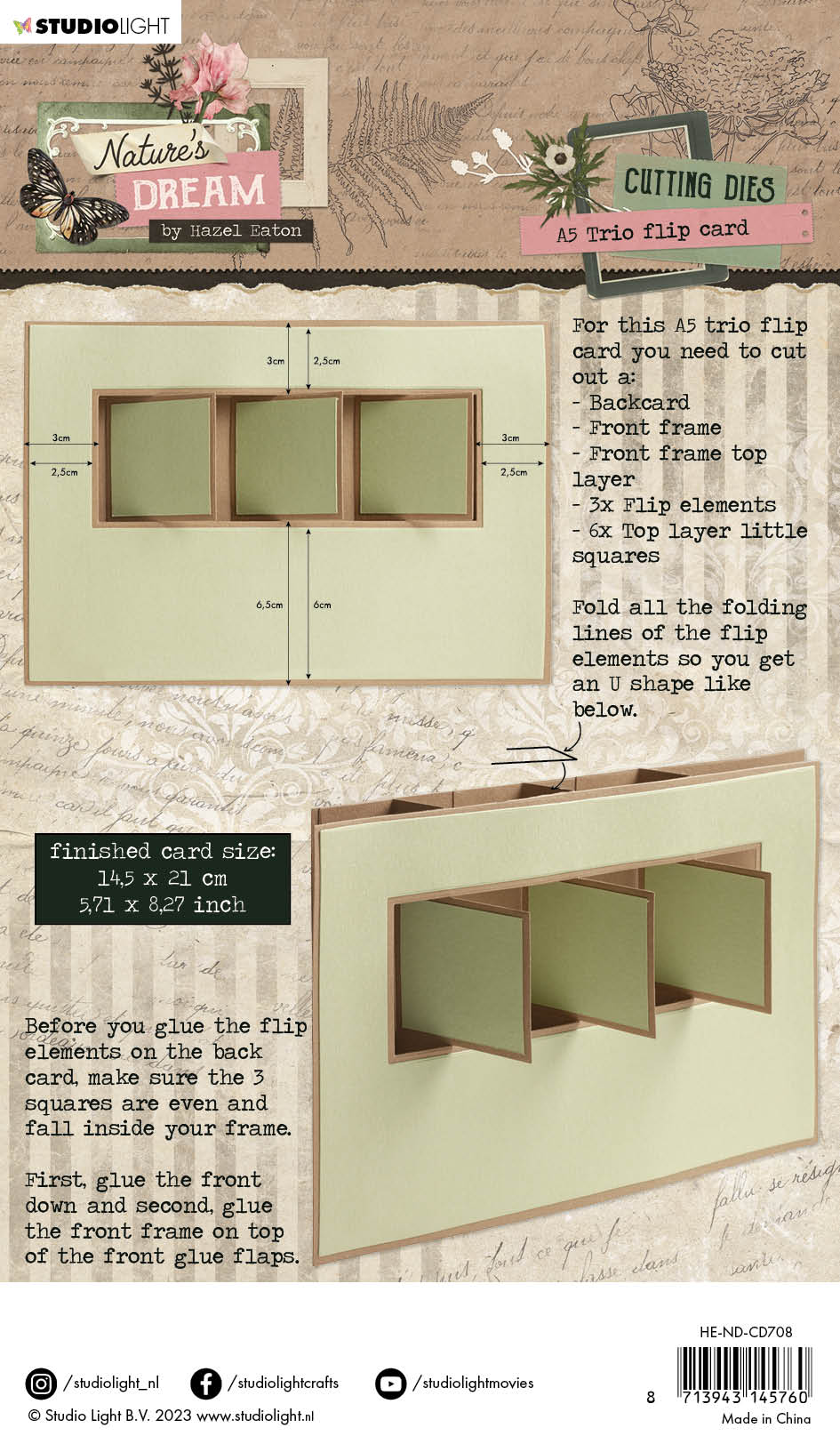 The dies will create an A5 trio flip card perfect for cards, invitations, or any other art projects These dies will work beautifully with the other dies from the collection. Part of Hazel Eaton's Natures Dream Collection. 6 dies.