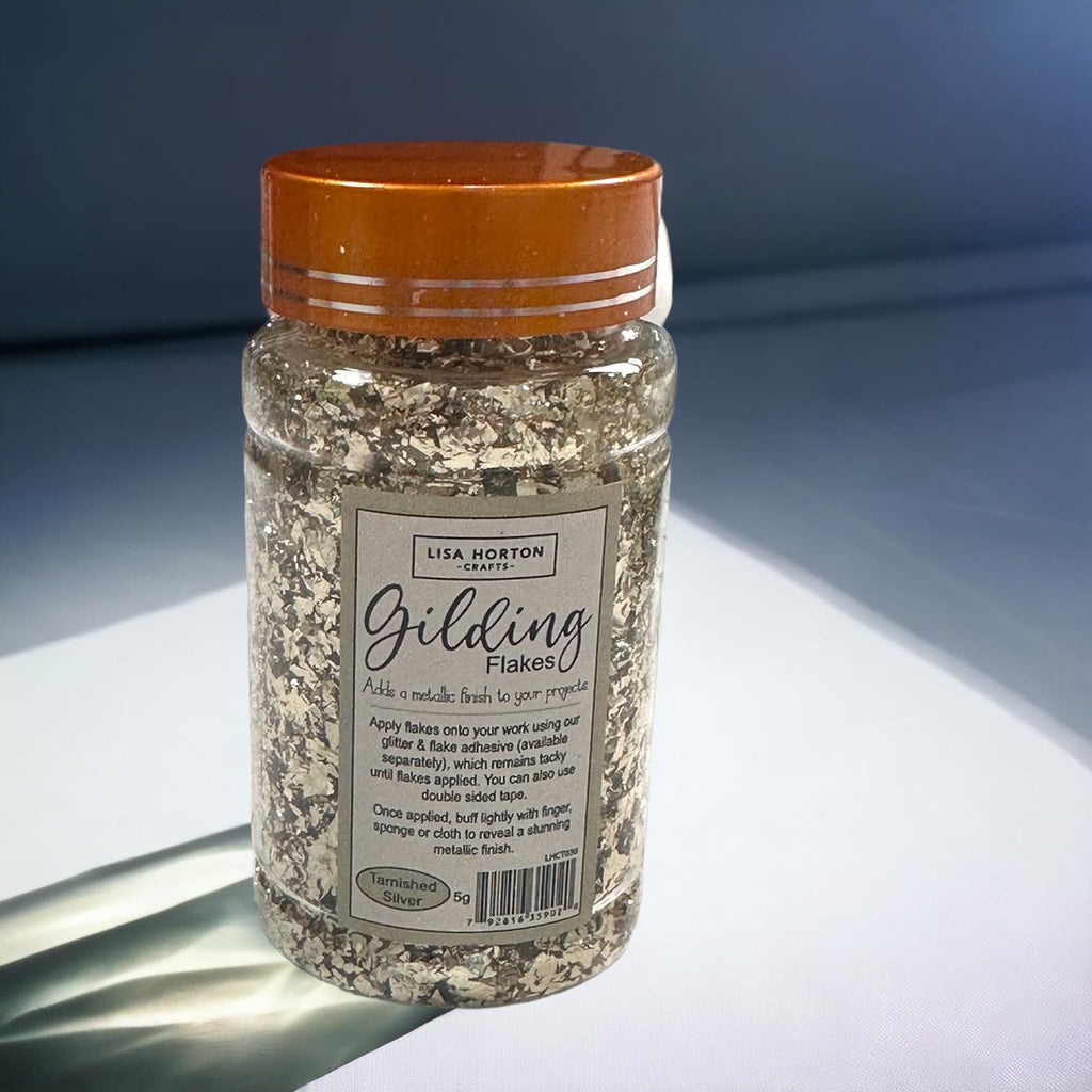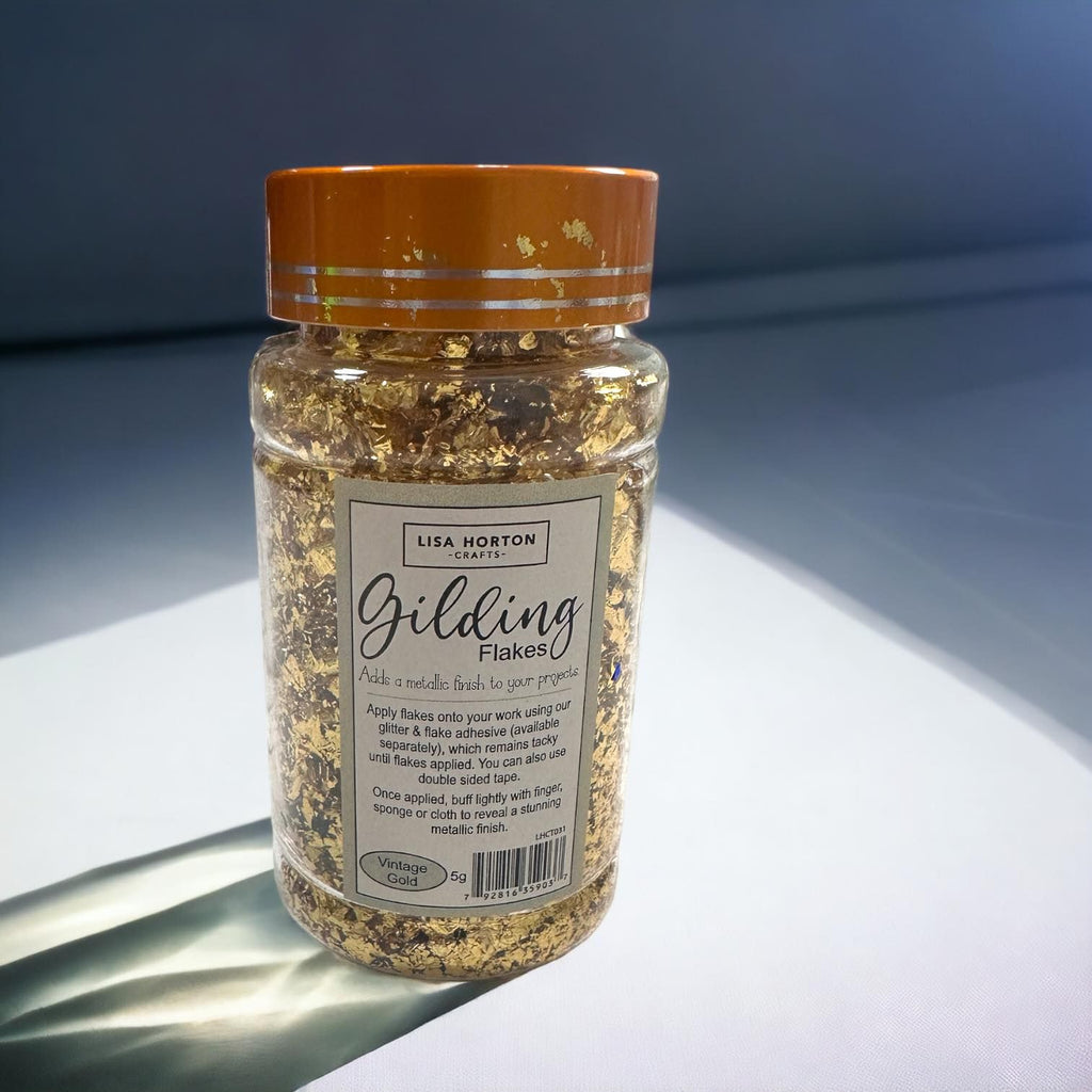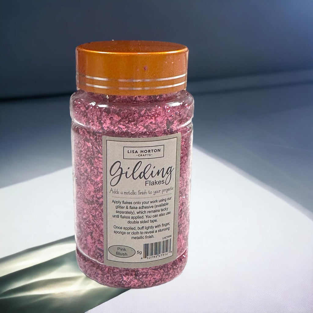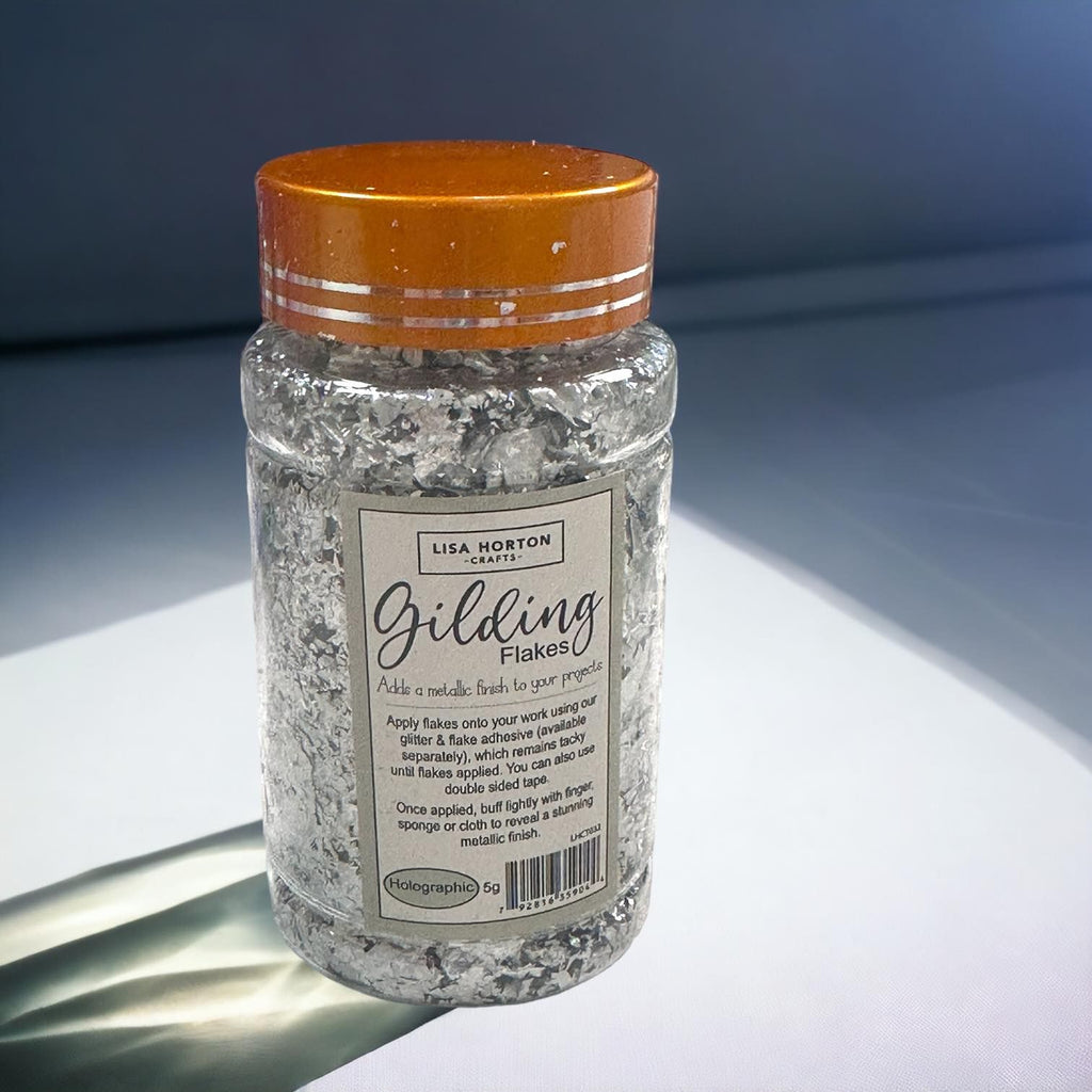 Create luxurious metallic effect backgrounds and highlights with these gorgeous gilding flakes. Apply flakes onto your work using a glitter and flake adhesive or you can also use double sided tape. Once applied, buff lightly with finger sponge or cloth to reveal a stunning metallic finish. 50ml