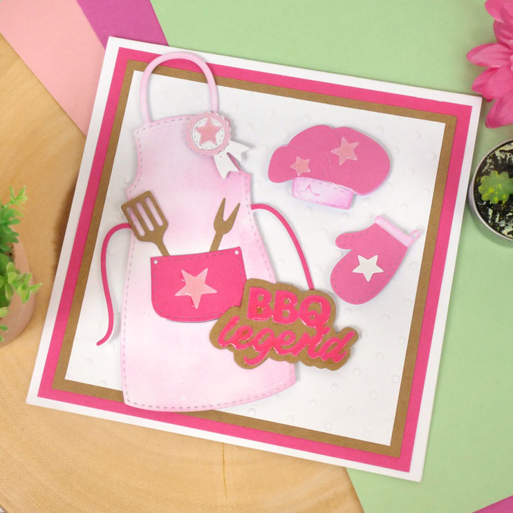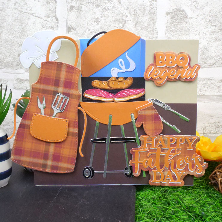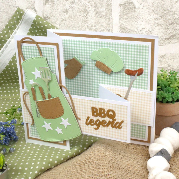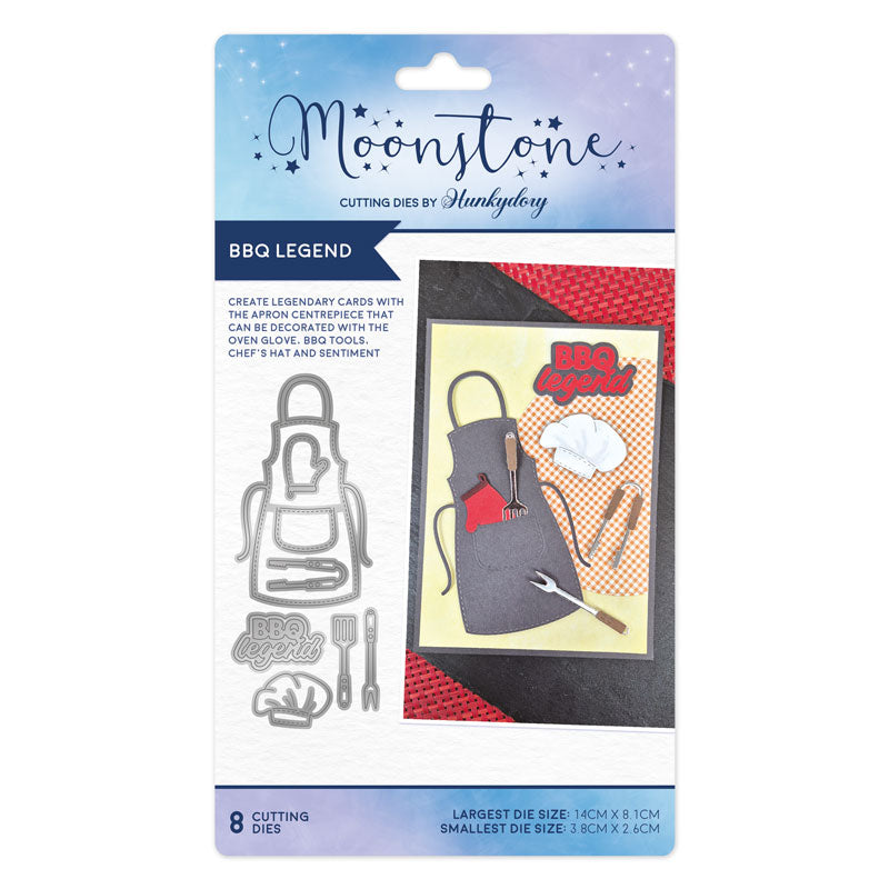 Create sizzling centrepieces and legendary cards with the Moonstone Dies - BBQ Legend die set! The set includes a large apron centrepiece, complete with stitched details and a large pocket. Decorate the apron with the oven glove, chef hat, cooking tongs, spatula and BBQ fork. These items make cards for chefs, inspiring cooks, BBQ enthusiasts and more! Decorate the apron with different colours and embellishments from your craft stash to create baking cards, craft aprons, DIY cards and more! Complete your cards with the ‘BBQ legend’ sentiment and co-ordinating mat layer.