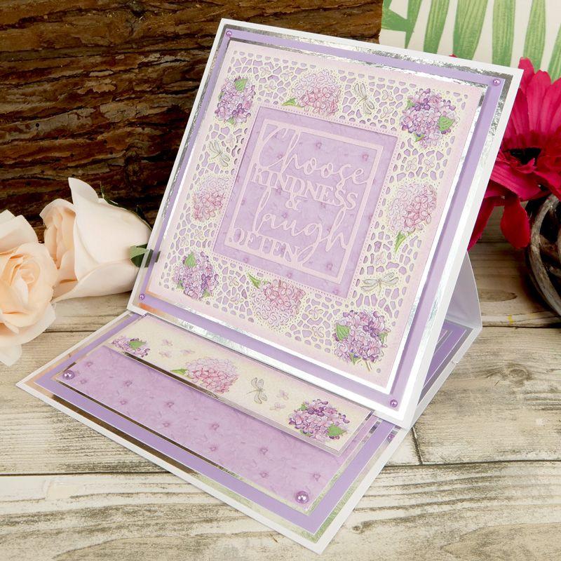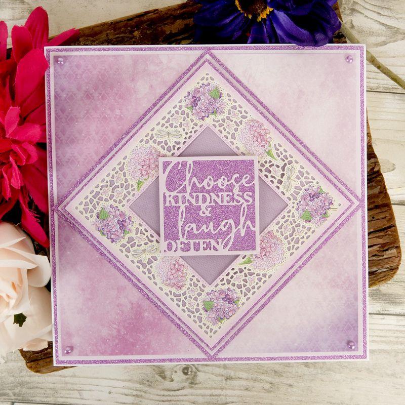 The Hydrangea Die Set includes 3 dies in total; 1 square outer cut edge die, 1 inner detail panel die and 1 square sentiment die. By using the outer cut edge and inner detail panel dies together, you can create a stunning lace frame panel which has beautiful hydrangeas all around along with dragonflies in flight and an array of individual petals. Each hydrangea flower head has gorgeous cut-in line detail highlighting the individual petals and leaves. Connecting all the elements is a filigree lace pattern and an inner scalloped border.