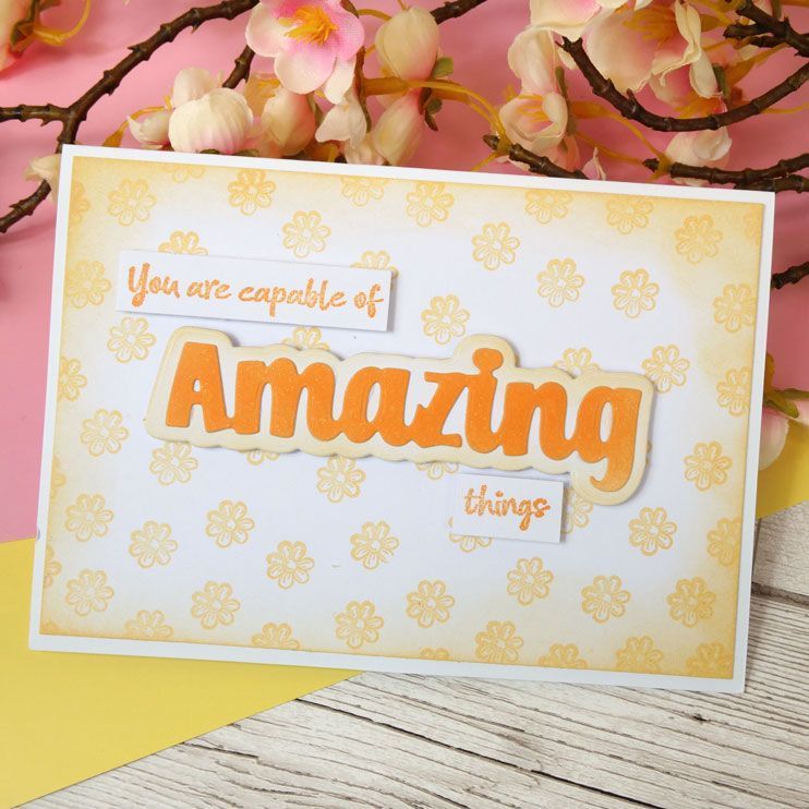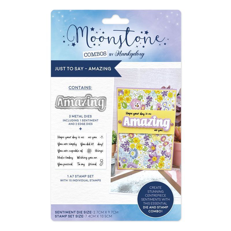 The Moonstone Combos - Just to Say - Amazing Set includes 3 metal dies and 15 individual stamps on an A7 sheet. The large centrepiece die features the word ‘Amazing’ in a bold, fun font and can be used with the selection of sentiment and word stamps to create your own greetings including: ‘You are capable of amazing things’, ‘Make today amazing’, ‘To my amazing friend’, and many more!