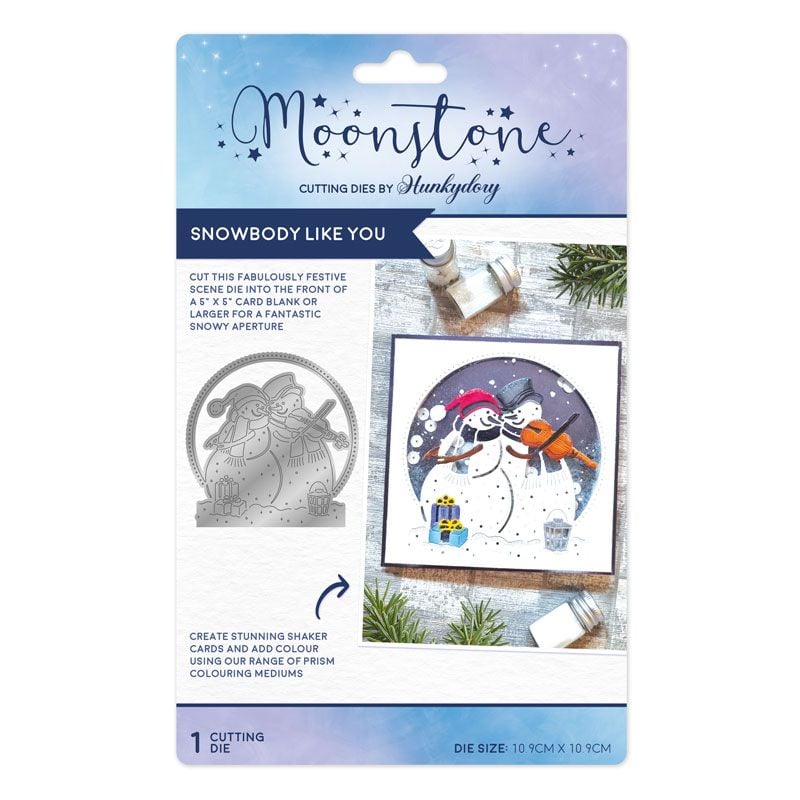 There’s no better way to celebrate winter than to build a sparkling snowman. Capture the fun (without it melting!) with the Moonstone Dies - Snowbody Like You die set. The large centrepiece die cuts an aperture into a 5” x 5” card blank, or larger, for a fantastic snowy scene. The cute winter scene includes 2 snowmen, both wearing hats and scarves, staring at each other lovingly whilst one plays the violin and is framed within a circular aperture surrounded by tiny dot details.