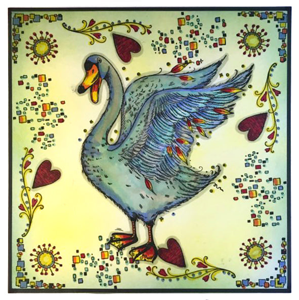 This clear photopolymer stamp set, Swan Jovi is part of the Wings Series from Pink Ink Designs. This stamp set features twelve beautiful stamps. These stamps come ready to mount on an acrylic block. Simply adhere to an acrylic block and use with your favourite inks, markers, embossing powders, and other crafting mediums. These stamps can be used on cards, scrapbook pages, and other paper crafting projects. They are suitable for paper, fabric, or any other surface depending on the ink choice. Made in the UK. 12 stamps. Size 6 in x 8 in (15cm x 20 cm).