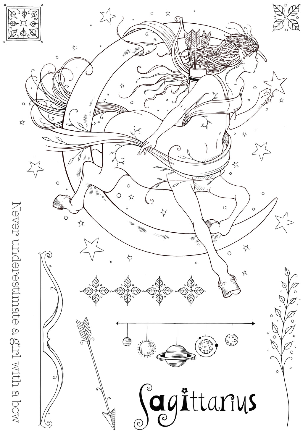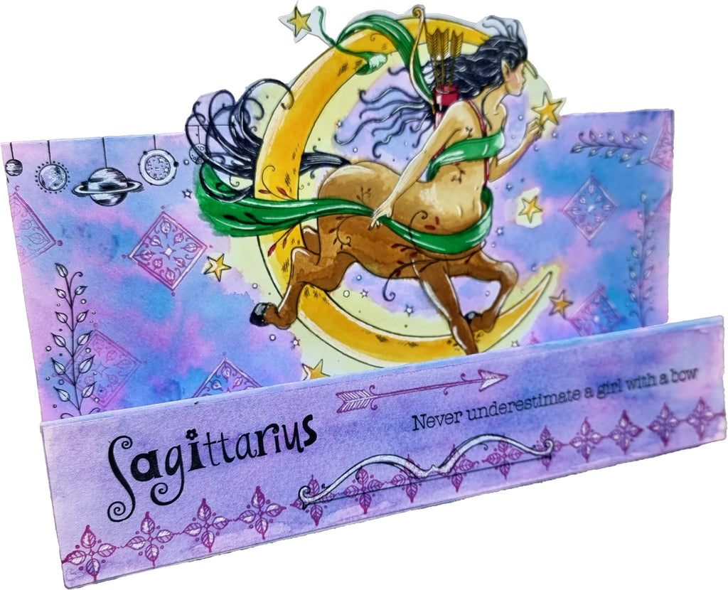This clear photopolymer stamp set, Sagittarius Knowledge Seeker is part of the Astrology Series from Pink Ink Designs. This stamp set features a beautiful main image with nine smaller images and sentiments. These stamps come ready to mount on an acrylic block. Simply adhere to an acrylic block and use with your favourite inks, markers, embossing powders, and other crafting mediums. These stamps can be used on cards, scrapbook pages, and other paper crafting projects. They are suitable for paper, fabric, or any other surface depending on the ink choice. Made in the UK. 10 stamps. Size 6 in x 8 in (15cm x 20 cm).