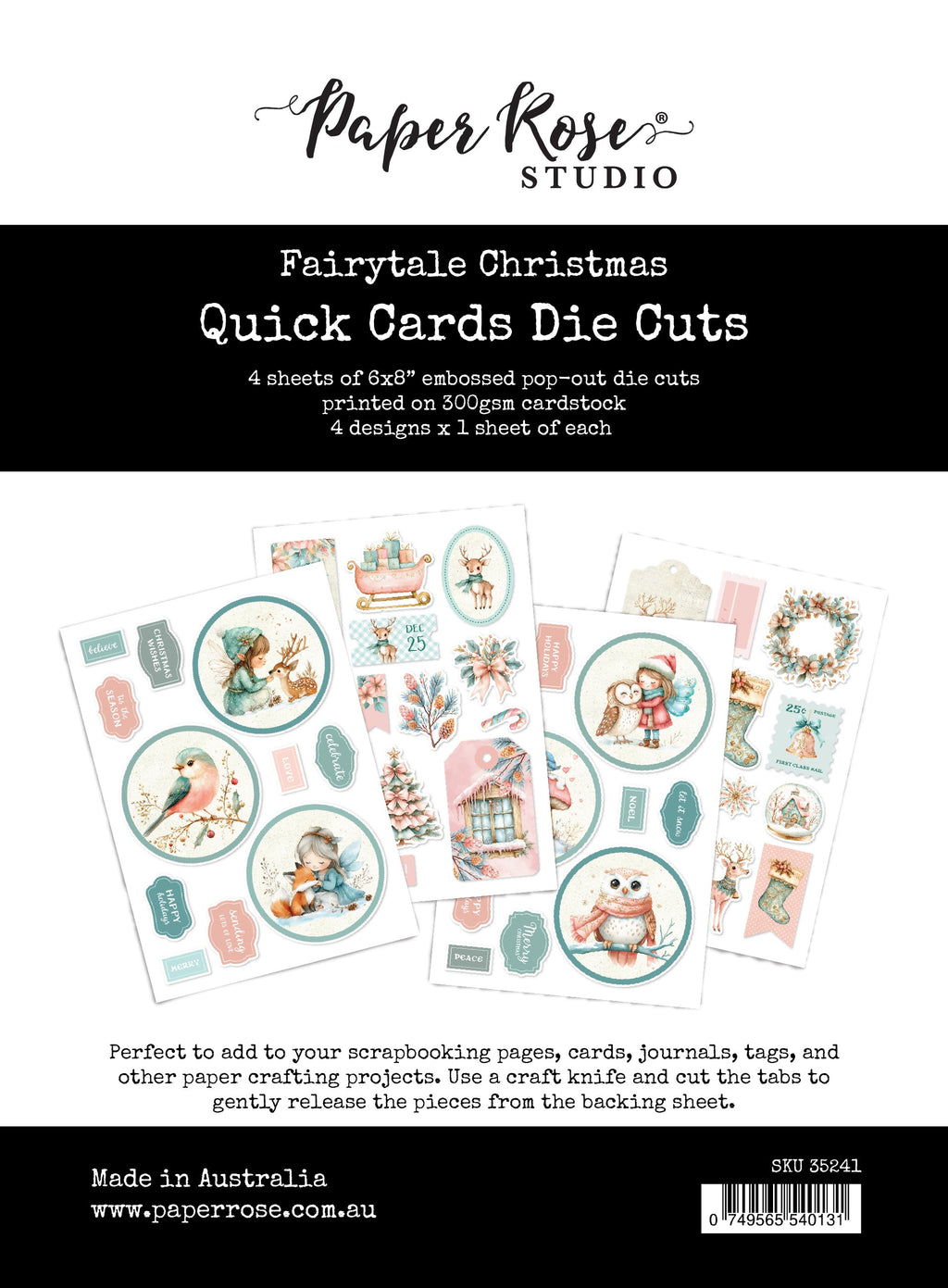 Perfect to add to your scrapbooking pages, cards, journals, tags and other paper crafting projects. This set includes extra die cuts and sentiments, which coordinate with the Fairytale Christmas Quick Card Collection 35238. 300gsm cardstock. Made in Australia.