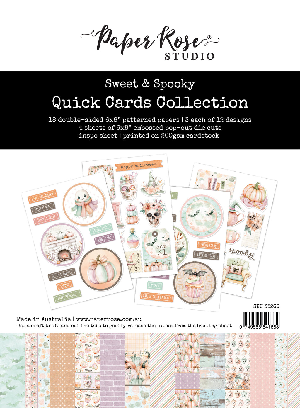 Experience the cutest Halloween yet with the Sweet & Spooky Quick Card Collection! Featuring a charming colour palette of soft pinks, blues, purples and oranges, perfect for adding a playful twist to your Halloween crafts. The papers in this set are adorned with detailed Halloween-themed designs showcasing pumpkins, Jack-O-Lanterns, friendly ghosts, bats, colourful leaves and festive treats, along with coordinating papers with star, stripe, brick and weathered wood patterns. The die cuts complement the papers with images of pumpkins, friendly ghosts, witch hats, skulls, bats and festive treats along with lots more Halloween imagery plus festive sentiments to finish off your projects. Perfect for seasonal projects, combining playful charm with spooky elegance.