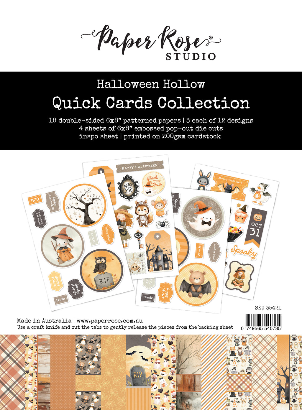 Celebrate the spirit of Halloween with the Halloween Hollow Quick Card Collection. Featuring classic orange and black hues, the papers showcase charming ghosts and festive animals dressed in costumes, plus lots more Halloween imagery, as well as some coordinating papers in stripe, polka dot and check patterns. The die cuts complement the papers with witches and ghosts along with lots more Halloween imagery plus festive sentiments to finish off your projects. This collection brings a playful yet timeless charm to your creative projects.