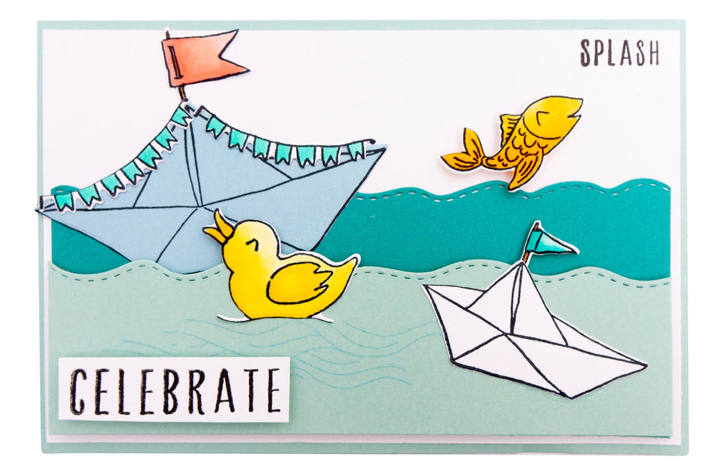 Perfect for many occasions this stamp and cutting die set can perfectly cut out the stamped elements. The set includes paper boats, a duck, a fish, banners, flags, waves and text. The stamps are made of polymer and are soft and textured, fitting snugly within the matching dies. They can be used for scrapbooking, mixed media, journaling and card making. Suitable for all die-cutting machines. 10 Dies, 13 Stamps.