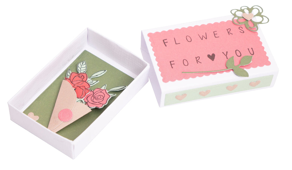 This stamp set includes 3 different rose heads, stems, a heart, a star and letters of the alphabet.  This stamp set combines perfectly with the matchbox cutting die SL-ES-CD113. Together you can make a flower bouquet, garland or add a label to the boxThe letters in the stamps are the perfect size to stamp a word or sentiment on the garland or on a label.