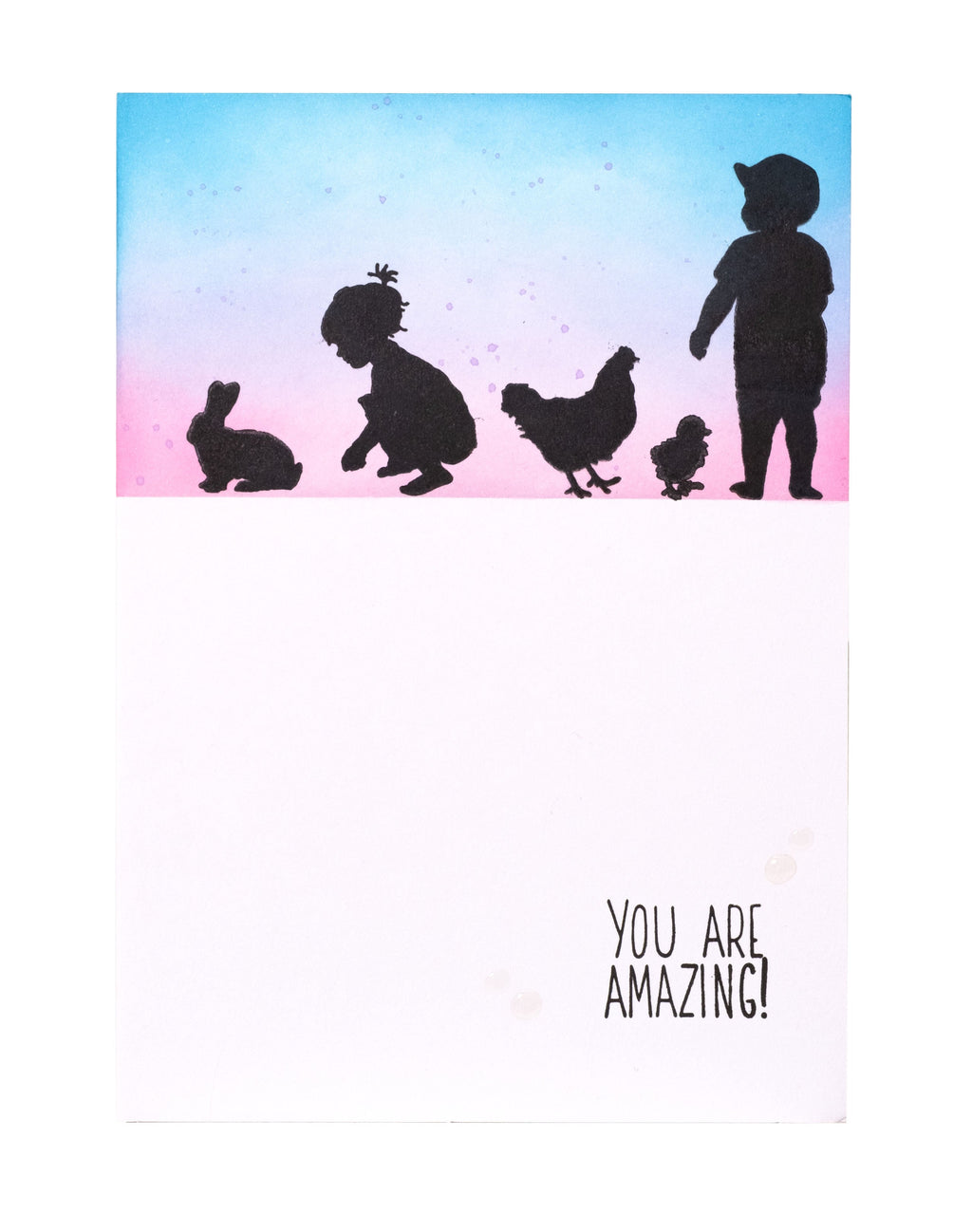 This 7 piece clear stamp set includes silhouette elements perfect for creating unique, beautiful, and personalized works of art. This set features 2 children, 3 bunnies, a pig and a goat element. Use these elements to adorn artwork or alternatively, build your own unique backgrounds, centrepieces and much more. Perfect for making beautiful cards and paper crafts. Make every project special with this must-have stamp set.