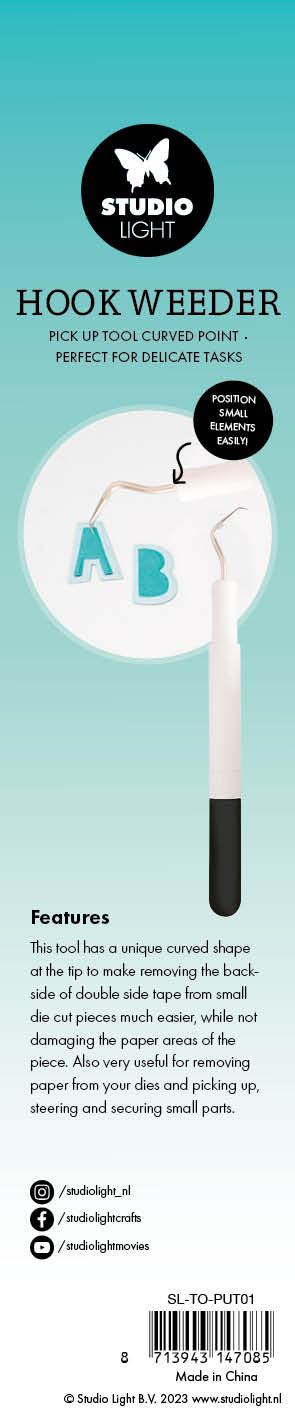 This tool has a unique curved shape at the tip to make removing the backside of double side tape from small die cut pieces much easier, while not damaging the paper areas of the piece. Also very useful for removing paper from your dies and picking up, steering and securing small parts.