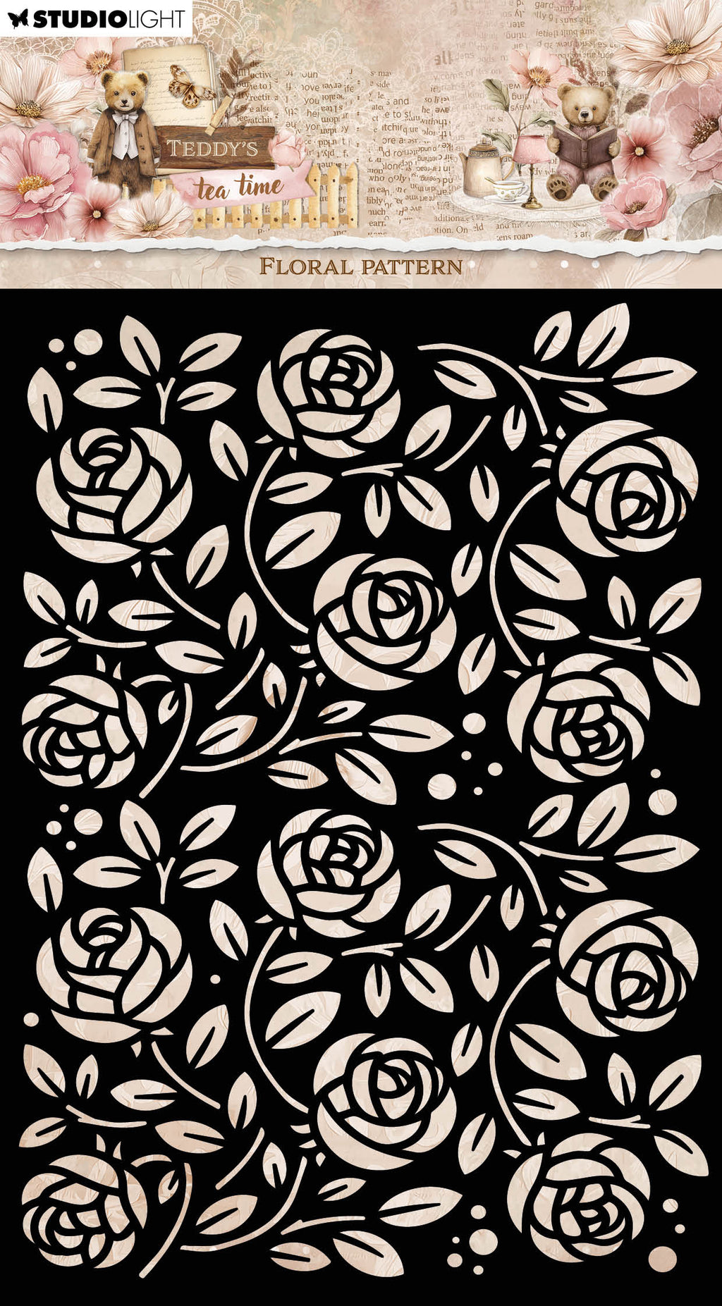 Use this floral mask with your favourite inks, dies, paints and pastes to create beautiful borders and backgrounds for your cards, mixed media projects, journals and more. Part of the Teddy's Tea Time Collection.