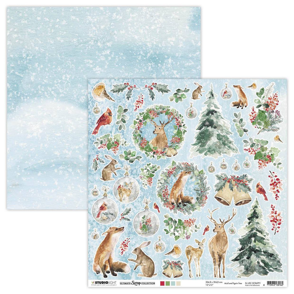 A double sided piece of scrapbook paper with a Wintery cool blue palette featuring bells, ornaments, deer, birds, foxes, rabbits, red berries, pine trees and branches on one side and a snowy image on the other side. Use for scrapbook layouts, cardmaking and other paper craft projects. Weight 200gr.