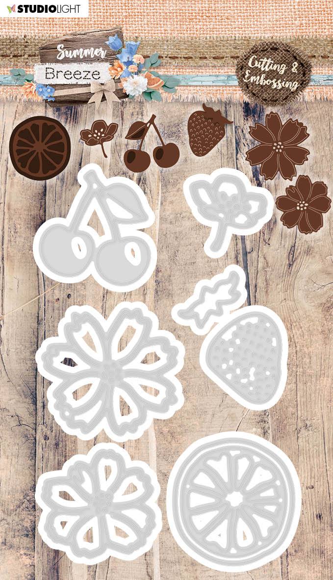 This set of cutting and embossing dies include some fun designs that are great for summer. Fruits and flowers look pretty on cards or scrapbook layouts. Includes 7 pieces.