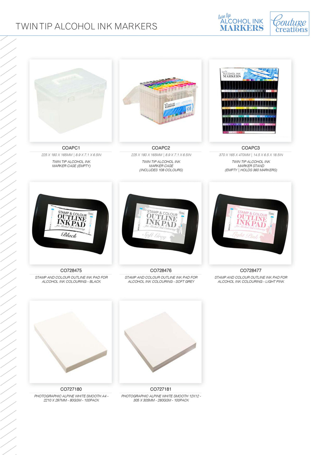 With a rounded triangle barrel to prevent rolling, a selection of 108 handpicked colours and tones and a twin tip design featuring a bullet tip at one end and a brush tip at the other, Couture Creations Twin Tip Alcohol Ink Markers are the perfect addition to your craft stash this year.