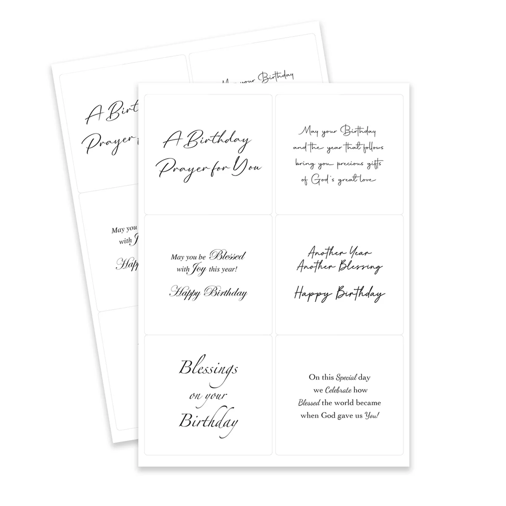 Featuring 24 unique Christian designs with two of each verse, our Peelables make it easy to attach inspiring words and blessings to your creations. These transparent, easy-to-use stickers are designed to save time while adding a thoughtful touch. Each verse beautifully conveys faith-filled sentiments, such as 'On this Special day we celebrate how blessed the world became when God gave us You!', 'Praying for You' and 'God Bless You!'.