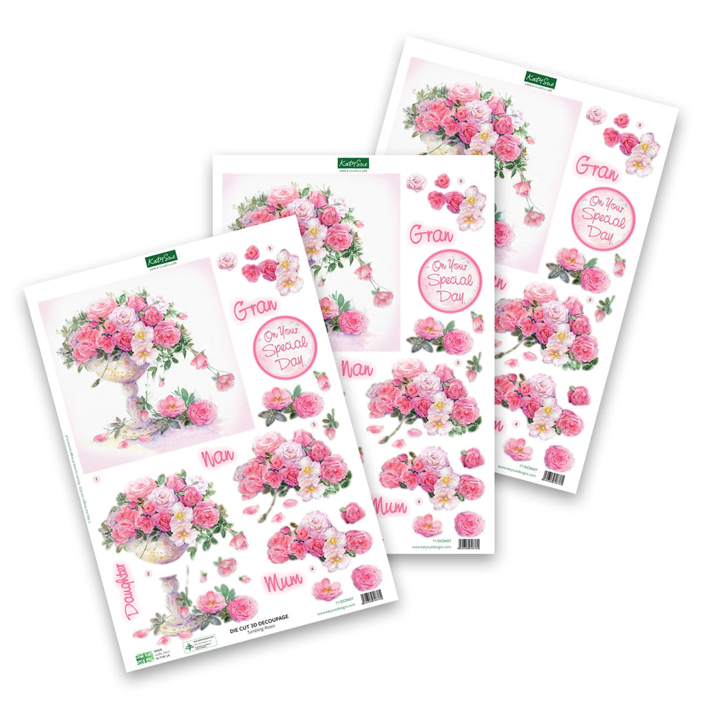 Pack of three intricately die-cut decoupage sheets, ideal as a 'quick make' for last minute cards. Each pack contains three sheets of one design. Simply press out from the sheet and layer up with either silicone glue or foam pads to complete your 3D image. Perfect for card making and other paper crafts.