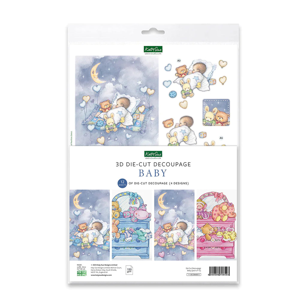 This beautiful selection of 12 sheets of baby-themed decoupage features four different designs. Each sheet is A4, featuring high quality printed designs, each intricately die-cut so they're ready for you to simply press out and create stunning 3D scenes for cards and craft projects.