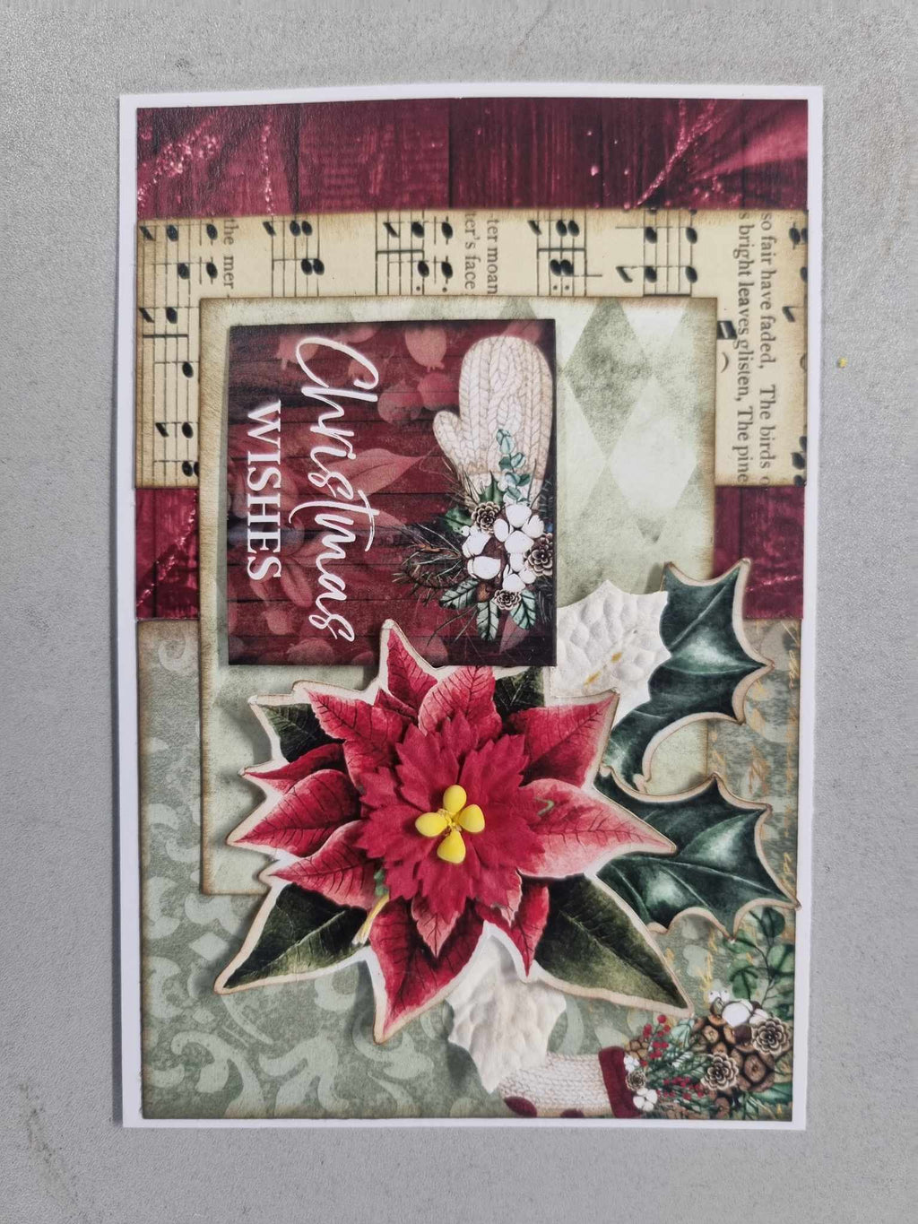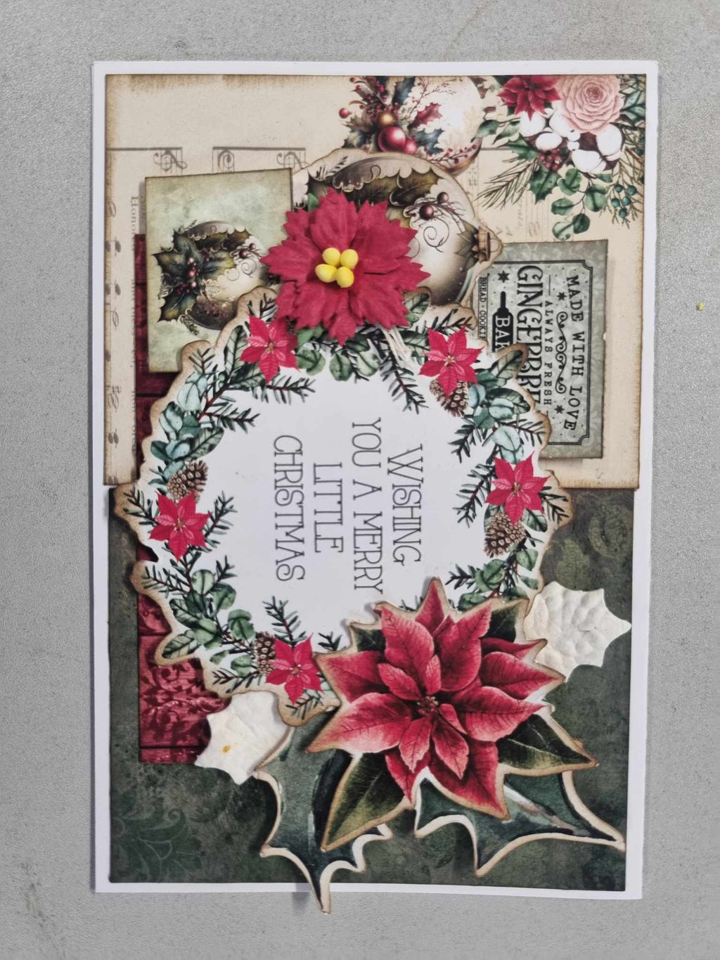 - 2x A5 die cut pages of ephemera featuring "December Wishes" elements with poinsettias, an evergreen tree, ornaments, gifts, a nutcracker soldier and more